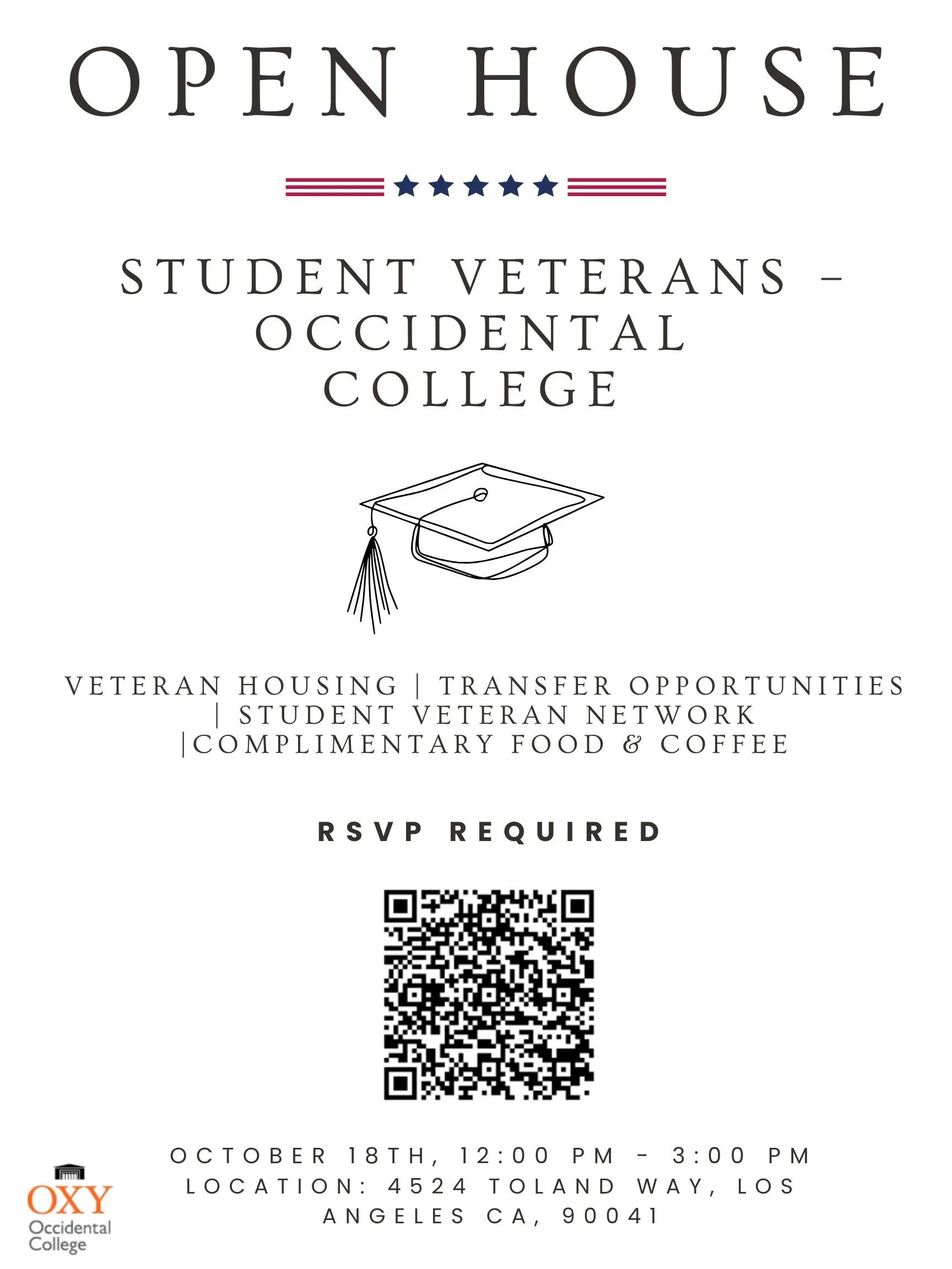 You are invited to Occidental College’s Student Veteran Open House on October 18th from 12:00 pm - 3:00 pm, created exclusively for you. Come tour Oxy’s dedicated Student Veteran housing units, connect with fellow veterans already thriving here, and learn how to maximize your VA benefits while exploring transfer opportunities into Occidental College.